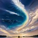 一个可爱的中国女孩 身穿白色汉服 在云层之上急速飞翔 云雾景色从脚下飞速略过 云雾涌动 远处 雷电间断闪耀