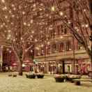 一个带帽子的可爱小男孩沿着铁轨行走,手里拿着风车