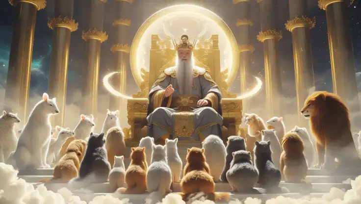 在天宫的宝座上,玉帝庄严宣布将选出12种动物来组成生肖。神圣的气氛弥漫在天宫中,所有神灵都齐聚一堂。