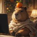 一只水豚在电脑前敲键盘,镜头缓缓推进水豚,水豚转头看向镜头,画面色调自然