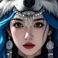 女孩头部大幅度运动,微风,头发随风飘舞,慢慢转身一圈后,侧身,脸部正对正前方镜头,此时狼的眼睛显现锋芒,希区柯克式变焦,镜头慢慢推近,最后聚焦于女孩的面部特写,时长10秒,