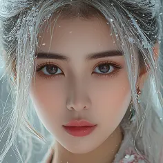 A cinematic slow-motion push-in shot of a young woman standing in a snowy landscape, wearing an embroidered pink silk gown with delicate floral patterns. Her silver hair cascades gently, strands catching the snowflakes. The camera slowly moves from a wide shot to a close-up, capturing the snowflakes resting on her hair and lashes as she gazes into the distance. Soft lighting, shallow depth of field, cold muted tones, high cinematic quality, emotional depth.