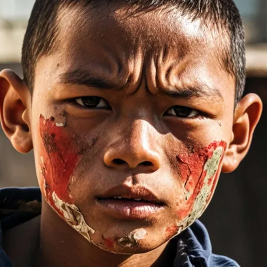 这个眼神绝望的少年站在荒野中,回头凝望着身后战火纷飞的安阳城(古代农村风格),镜头一开始给他脸部特写,随后从他右方滑过,并缓缓下降,焦点集中在战火纷飞的安阳城