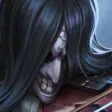 一只蓝色的长着人脸的大肥猫在吃麦当劳,后面有一个长头发的小提琴家用琴弓抽打蓝色的大肥猫