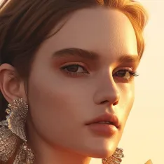 超写实大片风格,美女的头发和衣服漂动起来,人物微微眨眼睛,特写从耳坠拍到衣服,左右旋转运镜