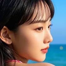 女人上半身面向观众,坐在行驶的高铁里,窗外景色不断倒退,女人偶遇前男友,面露羞涩和掩盖不住的高兴。