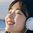 夏日森林的清晨,沐浴阳光,手触摸耳机,头转向正面,微笑睁眼