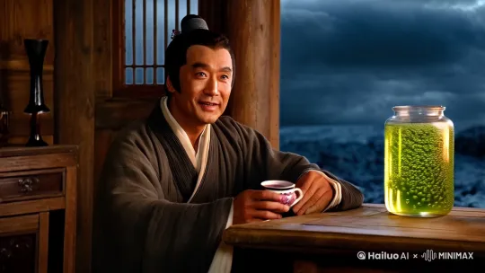 一位身着素袍的白居易拿着酒盅,面容和蔼,眼神中透着期待与热忱,坐在古朴的木桌前,桌上放着一坛新酿好的酒,酒面上漂浮着如绿蚁般细碎的泡沫 。旁边是一个红泥小火炉,炉中的火苗轻轻跳跃,暖光映在古人脸上。房间布置简洁,木窗半掩,窗外天色渐暗,浓厚的铅灰色云层压得极低,仿佛一场大雪即将飘落 ,屋内弥漫着温馨的气息。真人真景,写实,摄影