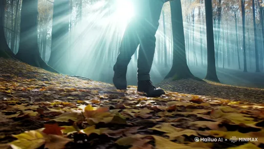 A cinematic shot of a hiker's boots crushing autumn leaves in a misty forest, hyper-realistic 8K detail with macro lens effect, morning light piercing through canopy creating volumetric god rays, color grading偏向青灰冷调