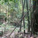 一个穿着原始部落装束的男性弓箭手,在丛林中追逐一只奔跑的水豚。镜头拉远跟随,紧张感 追逐氛围