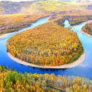 视频中,画面展示的是日落时分夕阳洒在一座高耸入云的额尔古纳亚洲第一湿地和附近的雪山上。雪山山体被白雪覆盖,山沿耸立,散发着寒冷而威严的气息,但是金黄色的夕阳也将雪山照的非常美。镜头采用无人机拍摄,从地面升起,穿越云层,向着天空的方向飞去,最终终于拍摄到山的全景。整个画面清晰,具有电影质感,以写实的风格展现了大自然的壮丽景象。[左移,上升]