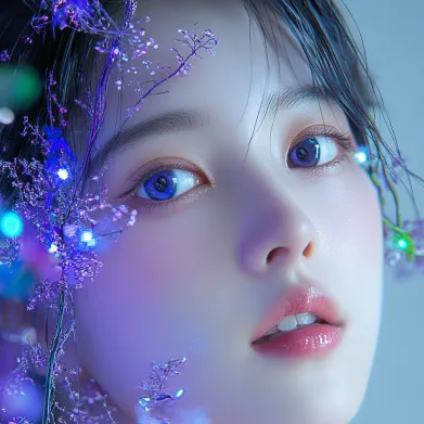 一位天使般的年轻女子身穿淡蓝色发光轻纱长裙,在梦幻般的奇幻鲜花海洋里奔跑。