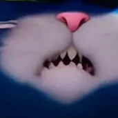 这只蓝色胖猫在麦当劳店里,背对着镜头登场,然后缓缓转过身来,之后微笑。