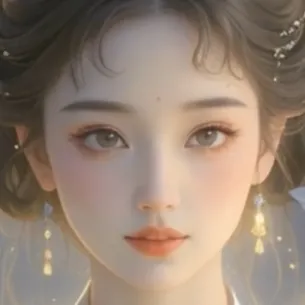 帮我生成一张图片:图片生成信息:一个温婉美人,亚洲面孔,五官精致,棕色头发,,头上戴着华丽的头饰(镶嵌宝石与流苏),古风玄幻风格,半身照,正面镜头,眼神温柔注视前方,身穿奢华古风长裙,青色与白色交织,丝绸质感,背景为玄幻风格的虚无空间,光晕效果,粒子特效,发光粒子点缀,侧光拍摄,突出面部轮廓与头饰细节,高光与阴影对比鲜明,三分法构图,主体位于画面中心,浅景深效果,背景虚化突出主体,色彩柔和,以青色,白色为主色调,画面层次丰富,细节纹理清晰,超高清像素,64K高清出图,艺术感,梦幻场景,高清渲染。比例 4:3。