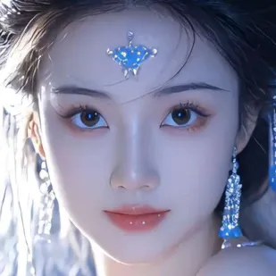腾云驾雾,神话,神仙,洛神,头戴华丽头饰,如梦如仙,胶片模拟,高清,电影灯光,眼部装饰着星辰,轻透蓝底,美白效果,8k,手臂上戴着镶钻手镯。