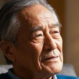 近景老人背影走在风沙里,风吹动他的头发