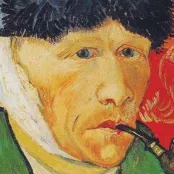 梵高艺术风格。男人穿着灰色的裤子和黑色的皮鞋,坐在镜子面前,镜子中反射出男人的侧脸。镜头后拉,男人站起来,踉踉跄跄地走出画面外。