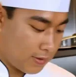 在大酒店的厨房里, 厨师穿白色衣服,厨师在白色塑料墩上切腰花,固定镜头,机位在右侧,近景。