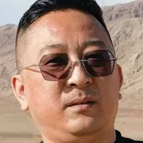 一个老板在美国时代广场向镜头走来,穿着高定西服,身后跟随6名保镖。电影质感。