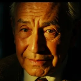 一个牛仔骑着马,穿过一片雪景,身后绑着一支步枪。他戴着宽边帽,身穿老旧的布衣。在他身后的远处,是高大的云杉林,林外是令人叹为观止的白雪皑皑的群山,地面上覆盖着洁白的积雪,牛仔缓缓在寒冷的旷野中骑马前行。他盯着前方,显得坚毅且勇敢