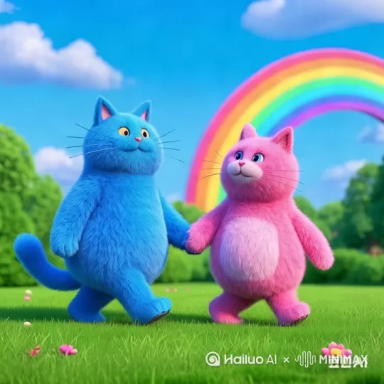 ![一只蓝色的毛茸茸的可爱的拟人化的胖猫手牵着一只粉色的毛绒绒的可爱的拟人化的粉色的胖猫,他们都有手有脚,直立行走,他们在一个绿色的大草原上漫步走着欣赏彩虹,角色整体在左边,彩虹在右边,粉色的胖猫指着彩虹示意让蓝色的胖猫看,类似于拍mv的那种效果图。[右移,跟随] by Hailuo AI Video Generator](https://cdn.hailuoai.com/prod/2025-03-27-19/video_cover/1743075483176549696-cover_654e499ce21efd37ac209839e50769fa.jpeg?x-oss-process=image/resize,w_540/format,webp)