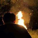 黄金时刻拍摄 + 温暖橙黄色调 + 长阴影横跨画面 + 柔和逆光勾勒轮廓 + 空气中飘浮细小尘埃粒子。男生弯下腰半蹲帮女生拍照,随后女生回头看向男生,男生站起身走向女生