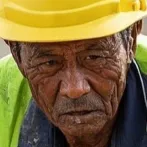 农民工蹲在地上吃午饭,他一手拿着馒头,另一只手拿着一根葱,满身的泥泞
