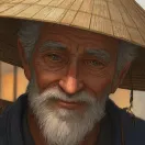 An old oil seller sets down a weathered bamboo pole, gourds clinking. He leans on the pole, squinting at Chen with a faint smirk, unimpressed. Dust motes float in the sunbeam between them—long shot showing distance between arrogance and humility.