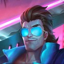 分镜2: 半神北极熊裹挟蓝色雷电跃向转台,半神奥恩挥动铁锤迸发赤红火焰。能量流撕裂木马残骸,燃烧的木块与冰晶碎片在俯视视角中交织。冷调霓虹光线穿透红蓝对冲的能量场,高饱和度色彩强化超现实战神的震撼对决。