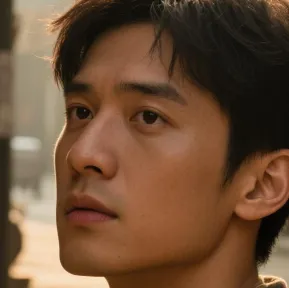 镜头最早从一个戴着面罩的人物面部开始后拉,年轻的宇航员穿着高科技宇航服,步伐稳健地走在月球的表面。远处,飞行器的阴影投射在崎岖的月球地面上,环绕着的是无尽的灰白色沙土和陨石坑。阳光从无云的黑色天际照射下来,四周的景象因强烈的光影对比显得异常震撼。