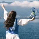 这个年轻女性穿着华丽的礼服,头顶带着绚丽的钻石皇冠,脚上穿着水晶鞋,手臂依偎着一只奶白色的温顺的小猫咪,然后缓慢踏上玻璃阶梯进入一个未来感十足的建筑物,左推右移镜头。