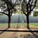 清晨薄雾中,一潭镜面般平静的湖水占据画面主体,低角度镜头缓缓推进。左侧蜿蜒的碎石小路沿湖岸曲线延伸至远方薄雾中,道路两侧排列着数十棵需两人合抱的参天古树,枝干虬结布满青苔。树冠层叠交织成拱形穹顶,飘落的紫粉色花瓣与半透明叶片在晨光中螺旋飘坠,逆光视角下叶脉呈现金色细纹。湖面倒影将紫粉色树影晕染成渐变水彩,微风掠过时泛起细碎涟漪,带动倒影中的色块如丝绸般波动。远景处两只白鹭掠过水面,翅膀拍打声与树叶沙沙声渐次响起。