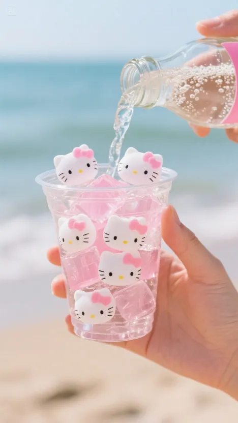 一只手稳稳托着透明塑料杯,杯里是粉嫩的水晶冰块,每一块都雕琢成Hello Kitty猫头部的模样,粉白配色萌趣可爱。另一只手拿着饮料瓶,瓶口倾斜,带着细密气泡的透明液体潺潺注入杯中。气泡在水中升腾、破裂,发出细微声响。Hello Kitty冰块随着水流微微晃动,仿佛在欢快舞蹈。背景中,海浪轻柔拍打着沙滩,蓝天澄澈,为这充满童趣的场景增添了悠闲惬意的氛围 。