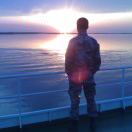 A woman in a beige trench coat hands a folded note to a man at a café table. They look at each other and smile, surrounded by the soft morning light of a New York street.