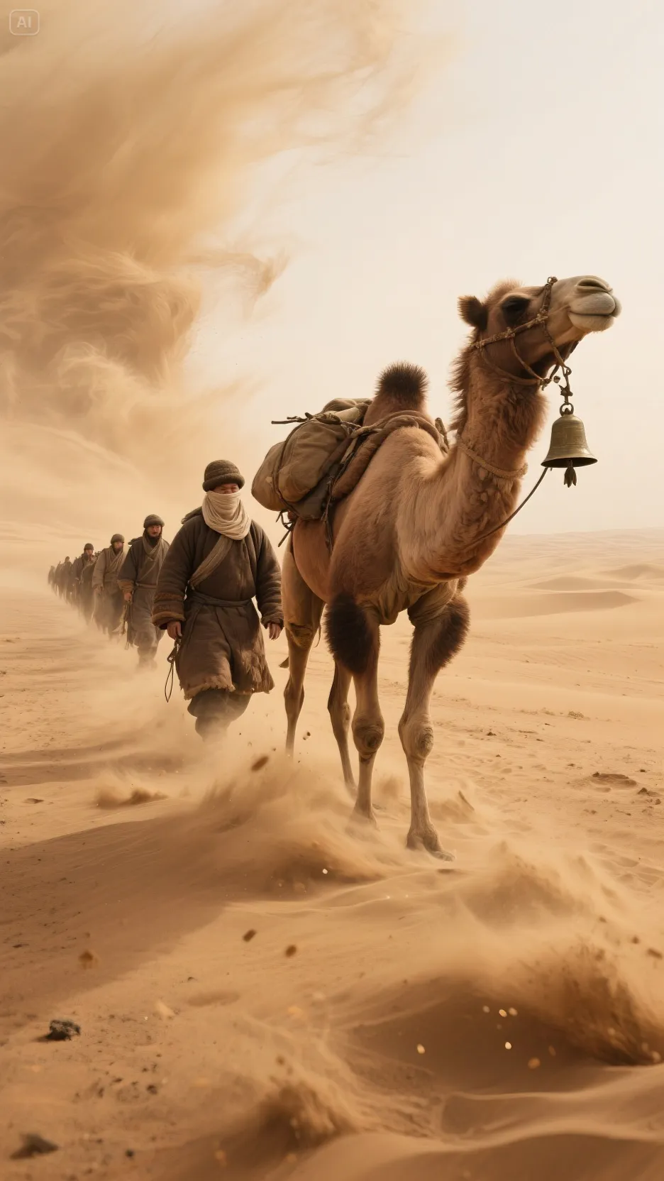 黄沙漫天飞舞,商队艰难的走着 - 运镜:使用RED KOMODO 6K以90帧的速度,从侧面平移拍摄商队,展现沙漠的辽阔与商队的渺小 - 特效:为风沙添加粒子特效,增强其狂猛的视觉效果