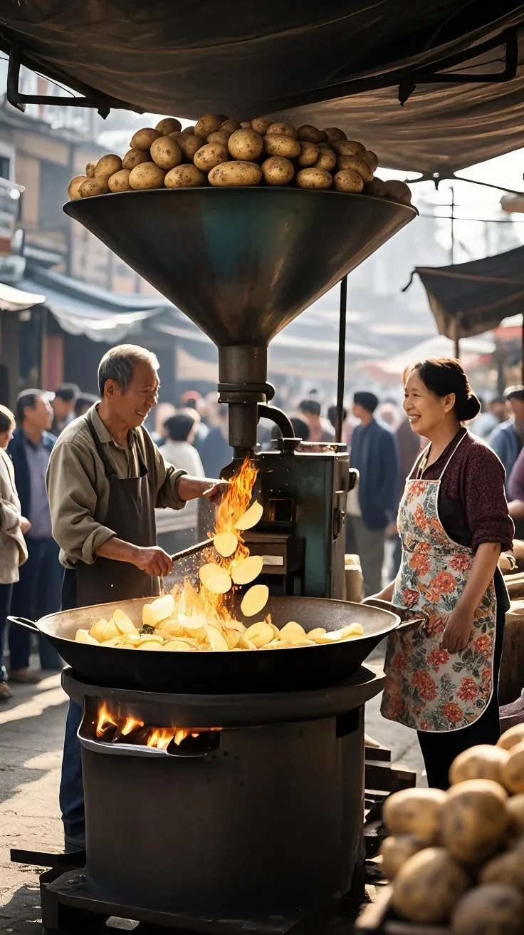 下面火炉烧起来,这位大姐用用空翻姿势拿着漏捎在锅里摇,土豆片围着大姐转,这位大哥在运转机器,