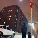 一个穿着黑丝袜的美女,穿着黑色的紧身皮衣。长发披肩。与一个牛头人身的肌肉猛男进行对打。环境是在。学校的门前。最终美女被打倒,衣服破损