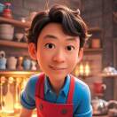 一个三岁的小男孩与它养的大白鹅玩耍,小男孩与大白鹅互相追逐,花园绿地,中景、近景、远景切换,阳光洒满花园