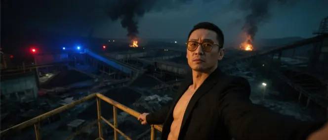 自拍视角,镜头跟随,男主拿着自拍杆,庆幸自己活下来了一边讲述刚刚有多危险,时不时回头看后面,远处厂房不断发出爆炸声,警报声四起。营造出一种戏剧性和紧张的氛围,动态模糊。