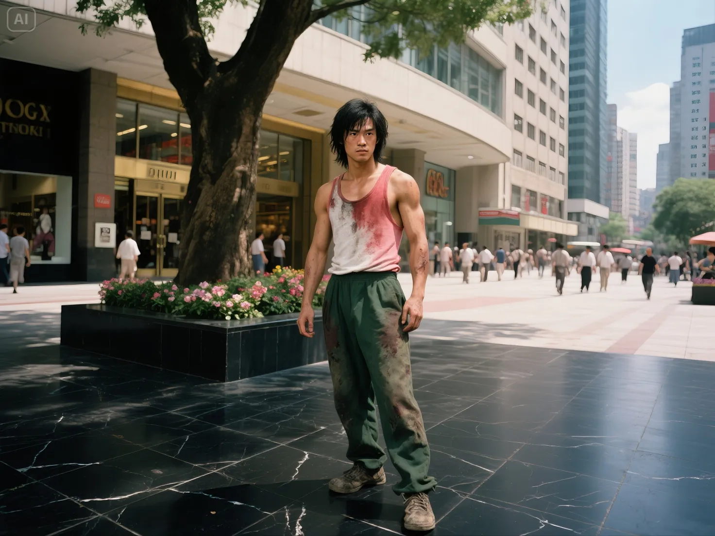 连续多个后空翻,随后一个弹跳飞跃上大厦楼顶上,站在高楼边低头往下面看,一大群广众围在下面抬头看着