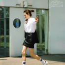 这是一个动漫校园女生,她用双手做着可爱的动作,对着镜头说话,背景有轻微的风吹动着树叶和彩旗。