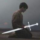 镜头缓慢,男生持剑手臂挥动,眼神望向镜头上方,身体上冒出黑烟